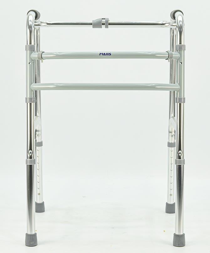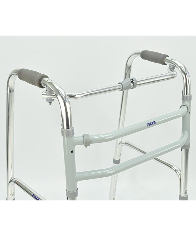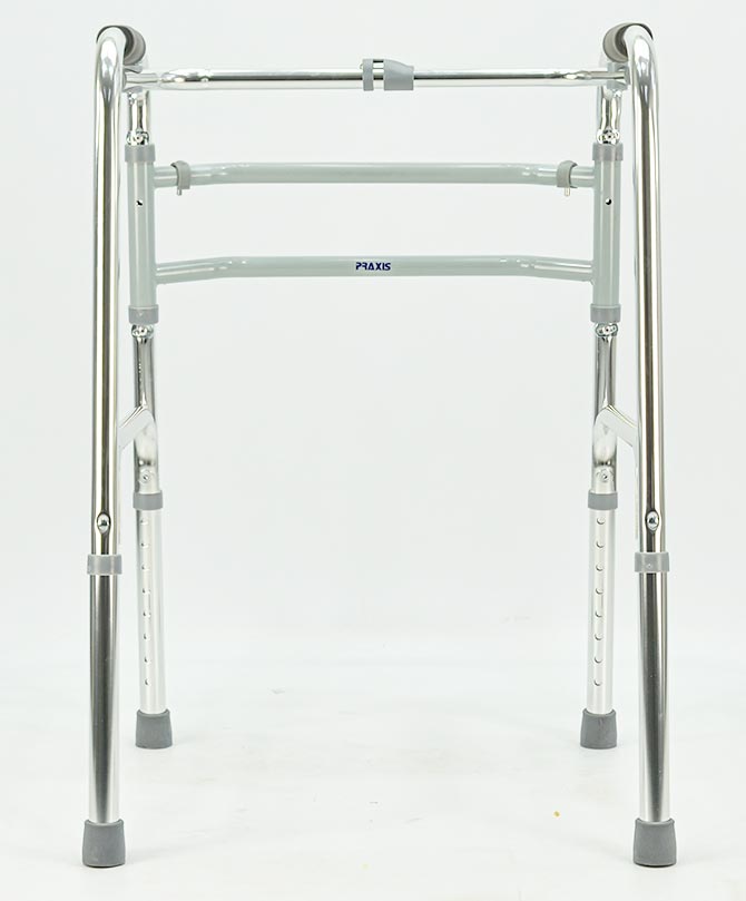 O quadro frontal do andador possui duas barras horizontais. Isto proporciona mais estabilidade e resistência a estrutura.