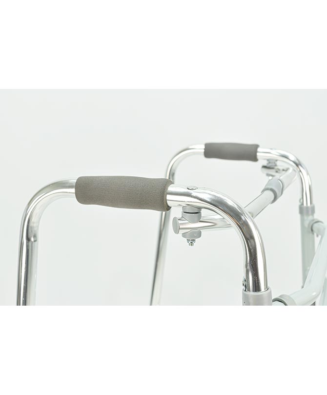 Na configuração articulado. O andador aberto permite um pequeno movimento entre as laterias e dessa forma possibilita que o andador acompanhe o passo do usuário.
